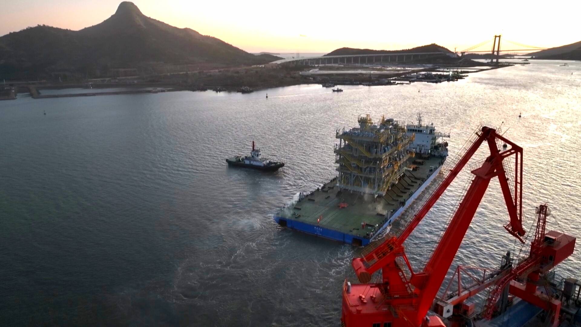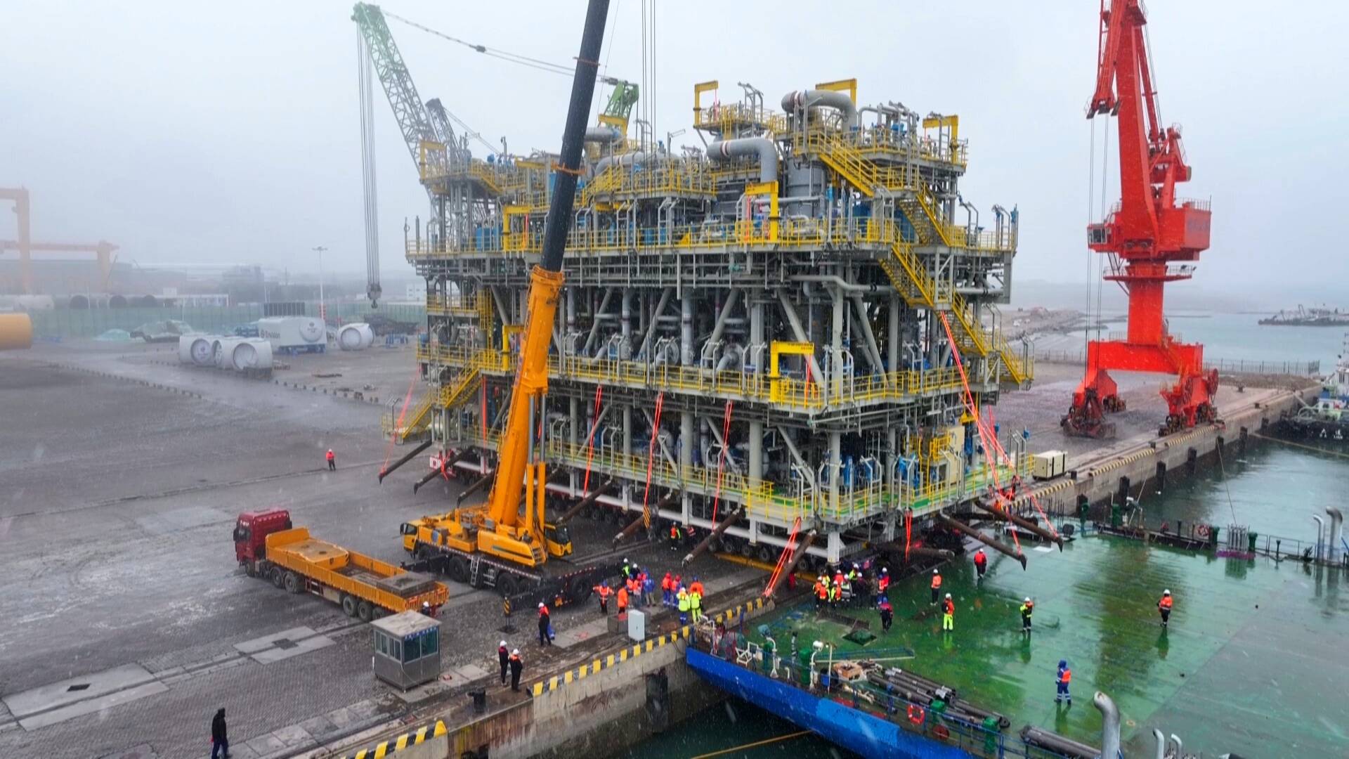 随着一声嘹亮的鸣笛划破长空,由山东豪迈重型装备有限公司生产的2500吨“海上移动油气工厂”乙二醇处理(MEG)模块,随着货轮缓缓驶离乳山港,向着土耳其方向扬帆远航。2026年1月底抵达目标地区后,这个“大家伙”将承担乙二醇回收处理的重要职责,对油田开采成本控制、实现油田绿色低碳发展起到关键作用。山东豪迈重型装备有限公司MEG模块项目经理林宾说:“我们这艘船将会于12月20日左右抵达新加坡,并于明年1月底抵达土耳其船厂,抵达土耳其船厂以后,将会对原有模块进行直接替换、安装和焊接。”